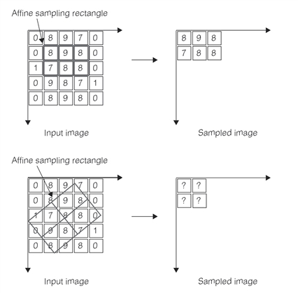 Affine rectangles which represent aligned orthogonal transformations of the input image client coordinate system can be used to create affine samples without the need to perform complicated processing. If the affine rectangle does not, some kind of sampling must be applied to produce a sampled image. The figure below illustrates this problem.