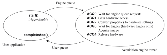 A queued start() invokes an acquisition engine thread that manages image acquisition. Each acquisition FIFO is associated with its own engine thread and each engine thread executes the following steps for each acquisition: