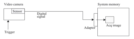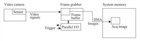An image is captured by the sensor of a video camera. Each sensor pixel stores an analog voltage proportional to the light falling on the sensor at that location. Most cameras transmit the sensor array pixel-by-pixel serially as an analog signal in a raster scan format to a Cognex-supported frame grabber. When an image is completely acquired in the frame buffer, the image is transferred to a pel buffer in system memory through the processor DMA channel. Once you setup the acquisition, from the time an acquisition is started until the image is in system memory no intervention is required from your application program.