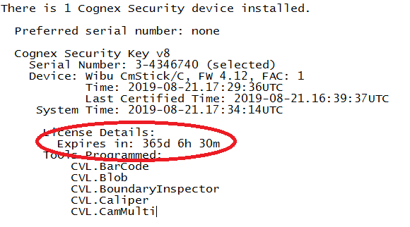 CVL software includes the Cognex Expiration Reminder to warn you of an impending expiration date. The reminder appears once a day if the security key if the key will expire within the next 30 days. Time-limited development keys are typically discarded at the end of their time limit. To get additional time with a new security key, contact your Cognex sales representative or Cognex Customer Support.