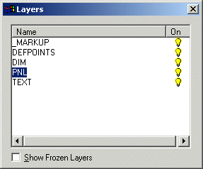 When you have opened your DXF file in Volo View Express, use View -> Layers to show the Layers popup window. This window lets you enable and disable the display of each layer independently. The figure below shows the Layers window with the names of the layers in the example DXF file plate.dxf, which is shipped with CVL in the %VISION_ROOT%\samples\cvl directory.