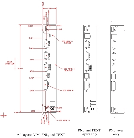 As shown in the figure above, in the example file plate.dxf, only the layer named PNL contains drawing primitive entities that are supported by ccCADFile. All information in the DIM and TEXT layers is ignored by ccCADFile.