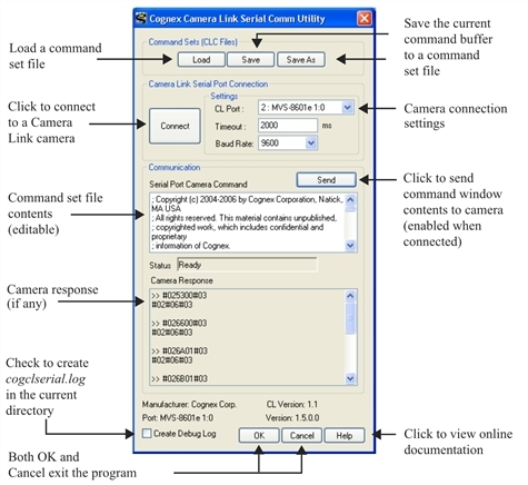 Start the utility by double-clicking the cogclserial.exe icon in this directory. (Both the 32-bit and 64-bit versions are named cogclserial.exe.) The utility has a single window as illustrated and explained in the figure below.