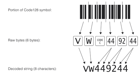 Decoding a Code128 symbol shows an example of how the number of raw bytes in a Code128 symbol may differ from the number of characters in the decoded string.