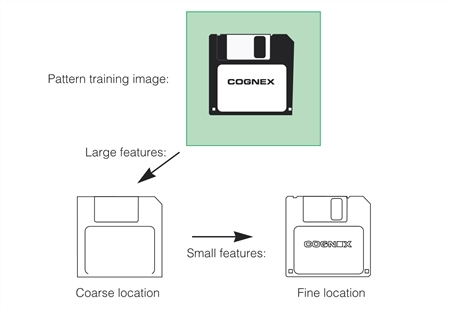 PatMax uses pattern features of different sizes to locate similar features in run-time images. In general, PatMax uses large features to find an approximate pattern match in a run-time image quickly, and small features to determine the pattern location precisely.