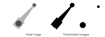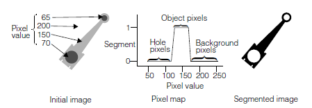 The figure below shows an example of an image where thresholding does not produce the desired result. The image shows a dark part on a light background. Because of poor lighting conditions, the two holes within the part have a pixel value that is less than the pixel values for the part. Any threshold that assigns the pixels that make up the part as object pixels will also assign the pixels that make up the holes within the part as object pixels. Alternatively, a threshold that assigns the pixels that make up the object to a different segment from the pixels that make up the holes within the part will assign the pixels that make up the part as background pixels. The figure below shows the results of both types of threshold segmentation on the image.