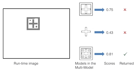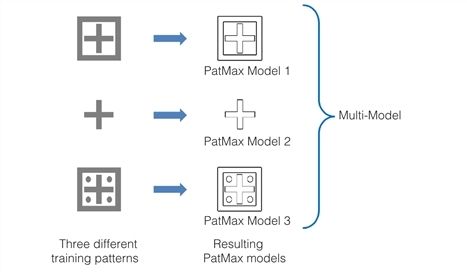 You can use a Multi-Model to discriminate between multiple different patterns. The following figure illustrates how a Multi-Model is created with standard PatMax models.