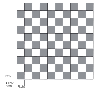 When you run the feature extractor, you specify the checkerboard square size in physical units (pitch). This establishes the relationship between pixels and physical units. You also specify an origin for the checkerboard grid. The location of feature points will be reported relative to this origin. Specifying the calibration plate origin is discussed in Setting the Origin. You can also use a checkerboard calibration plate with Data Matrix codes that encode the pitch, in addition to specifying the origin for the checkerboard grid (origin of Plate2D).