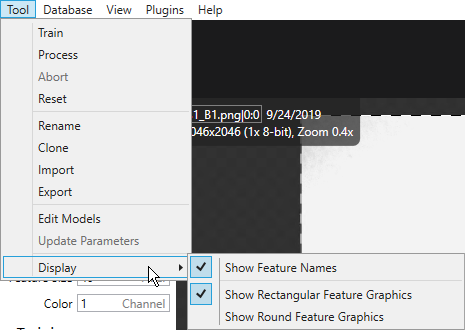 To change the display of the feature label graphics, go to the Tool menu and open the Display sub-menu.