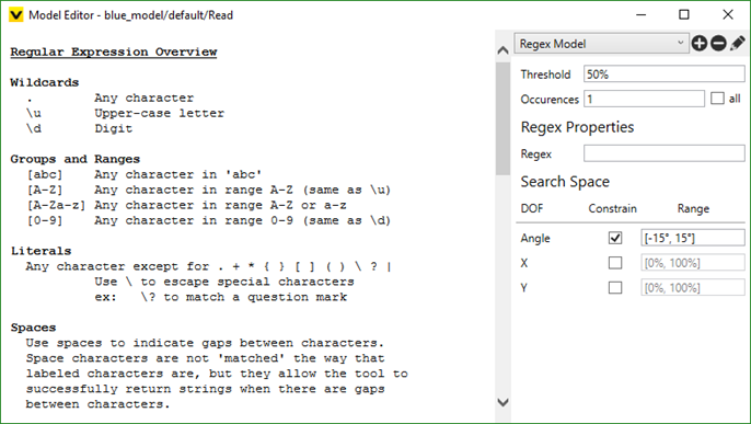 - 正则表达式模型将返回 ROI 内与您的正则表达式相匹配的字符。匹配的字符必须沿一条水平线分布,该水平线由角度参数定义,是相对于 ROI 水平轴的允许偏差。