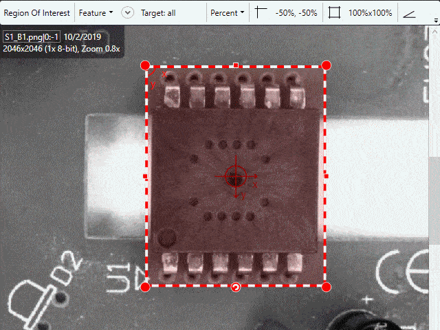 After Cognex VisionPro Deep Learning Tools are added, you will need to adjust the Region of Interest (ROI) to define the View that the tool will operate within. You can adjust the size and placement of the ROI using the graphic handles in the image. This allows you to re-size the ROI, and to move it within the image.