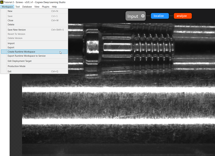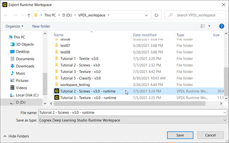 VisionPro Deep Learning을 실행한 다음, VisionPro에서 사용하려는 도구가 있는 워크스페이스를 열고 런타임 워크스페이스(.vrws)를 생성하십시오.