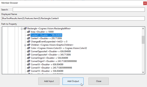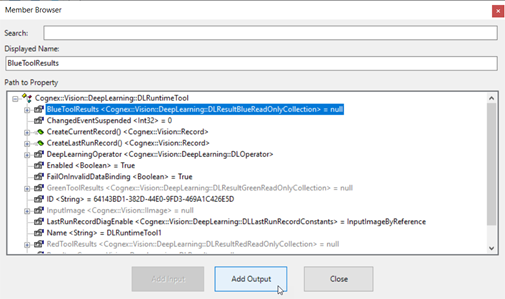 Tip: 지원하는 모든 파라미터 값과 결과값들을 찾을 수 있으며, 이 중 원하는 멤버 변수를 찾은 다음 이 값을 불러온 Edit Control에서 런타임 워크스페이스의 입력값(Add Input) 혹은 다른 VisionPro 도구로 넘겨줄 결과값(Add Output)으로 사용할 지 선택할 수 있습니다. Edit Control 입력 파라미터에 대한 자세한 내용은 VisionPro Deep Learning 문서를 확인하십시오.