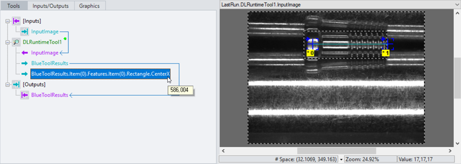 불러온 도구로 이미지를 프로세싱한 결과를 LastRun.DLRuntimeTool1.InputImage에서 확인할 수 있습니다. DLRuntimeTool를 다른 VisionPro 도구와 함께 사용하는 방법에 관한 더 자세한 내용은 VisionPro 문서를 참조하십시오.