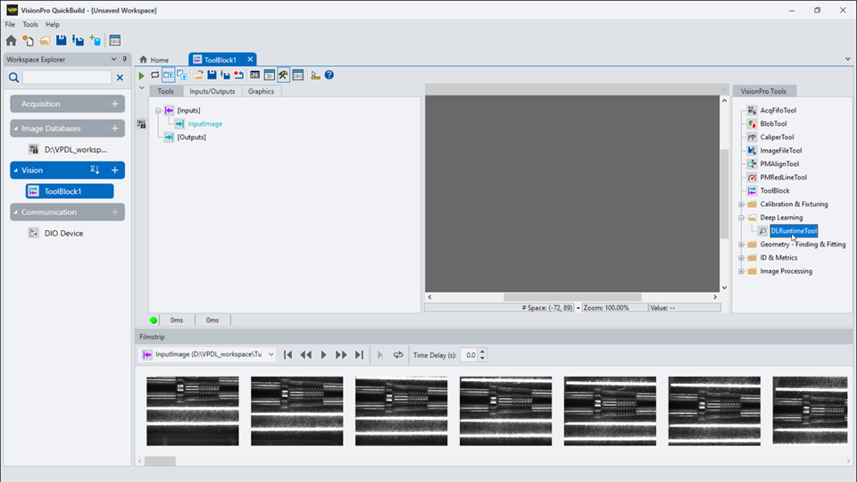 VisionPro10.0 QuickBuild를 실행한 후, VisionPro Tools에서 Deep Learning 아래에 있는 DLRuntimeTool을 더블 클릭하여 이 도구를 도구 블록에 추가하십시오.
