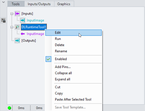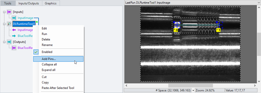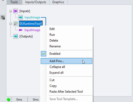 원하는 VisionPro Deep Learning 도구 결과값을 핀으로 추가하기 위해, DLRuntimeTool1을 우클릭한 후 Add Pins...를 선택합니다.