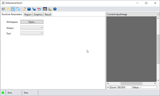 DLRuntimeTool1 Edit Control에서 Open을 클릭하여 이전 단계에서 저장한 VisionPro Deep Learning 런타임 워크스페이스를 불러오십시오. 불러온 후, 사용하려는 스트림, 도구를 선택하십시오.