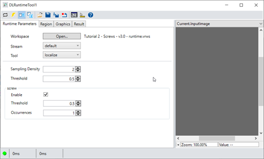 런타임 워크스페이스, 스트림, 도구가 모두 지정되었다면, Edit Control을 종료하십시오. 이후 원하는 때에, Edit Control을 열어 불러온 VisionPro Deep Learning 도구의 프로세싱 매개변수를 설정, 변경할 수 있습니다.