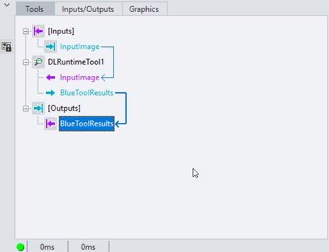 VisionPro QuickBuild에서 DLRuntimeTool1.InputImage와 Inputs.InputImage사이에 링크를 생성합니다.