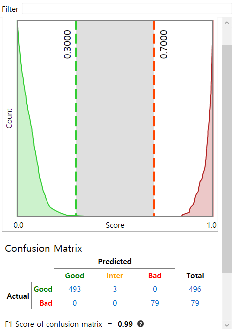 基于视图计算时,将对每个视图而不是每个区域进行标记。对于一个视图,如果此视图中存在得分足以超过 T2 阈值的缺陷像素,则将其预测为“不良”,否则预测为“良好”或“中间”。
