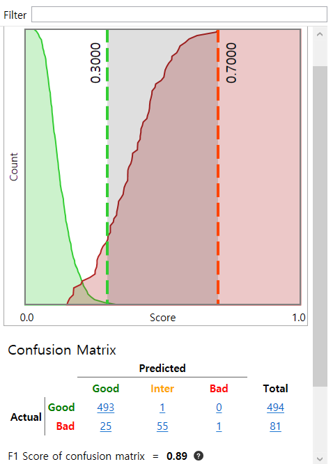 视图的代表得分是此视图中像素的最高得分。每个得分是每个像素的缺陷概率。例如,对于一个视图,如果此视图中存在得分足以超过 T2 阈值的缺陷像素,则将其预测为“不良”,否则预测为“良好或中间”。