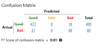 0.5 * (良好类的 F 得分) + 0.5 * (不良类的 F 得分) = 0.476 + 0.334 = 0.81