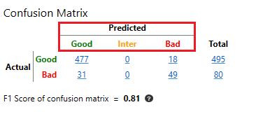 根据此设置,“良好”类的混淆矩阵的精度、召回率和 F1 得分的计算如下: