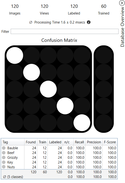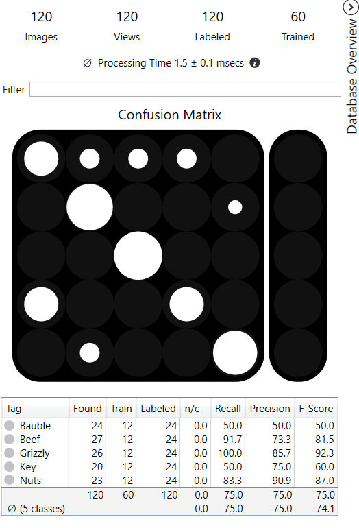 左侧的混淆矩阵是右表的表示。如果您单击数据库概述上混淆矩阵中的每个圆圈,表格的每个单元格中的相应项目(视图)将显示在VisionPro Deep Learning 工具 GUI上。