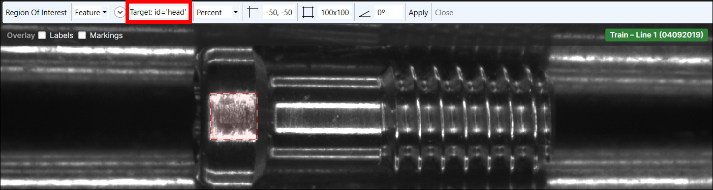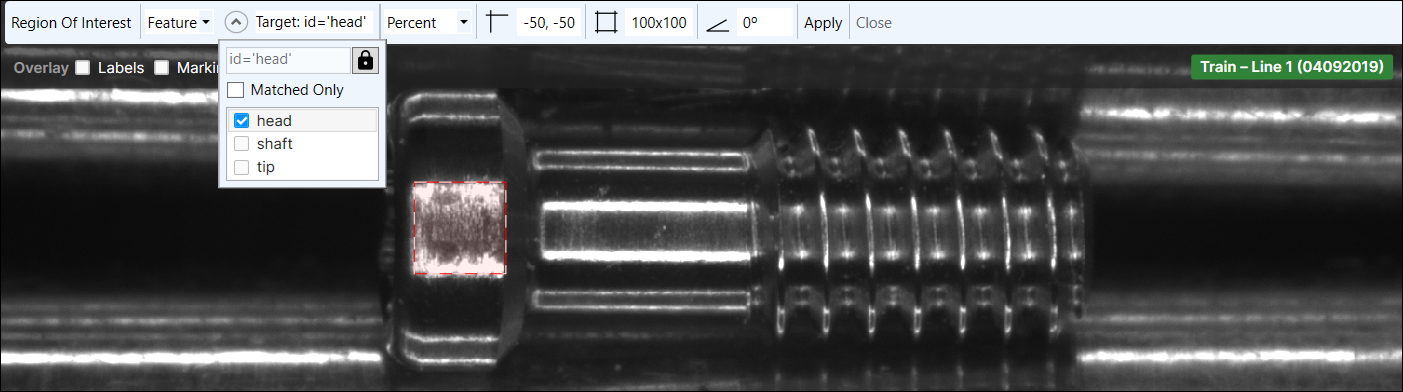 - Disable the Centered checkbox and use the mouse to move the ROI over the screw.