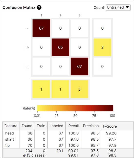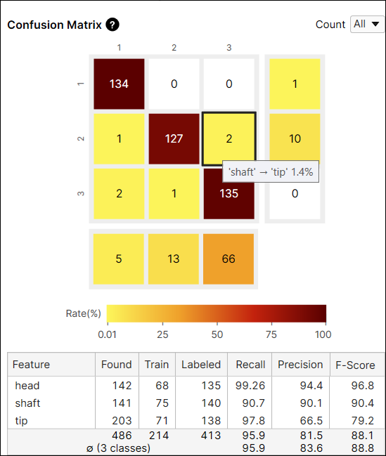 For another example, the color of the cell at the index (2,3) is yellow because among the features whose label is 'shaft' the number of features predicted as 'tip' is 2. The number of features predicted as 'tip' accounts for 1.4% (2/140) of the features whose label is 'shaft.'