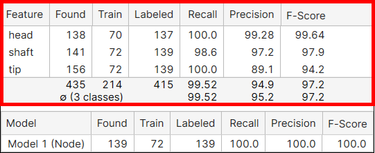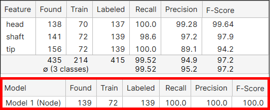 A found model is said to be a correct match (correctly marked model) if there is a labeled model in approximately the same position and if this found model has features that are close to the corresponding labeled features. The precision, recall, and F-score of model are calculated on this ground, and if there are multiple models in a view all model metrics are calculated by each model separately.