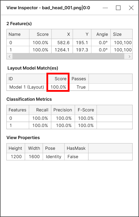 For Blue Locate tool, a layout model score (model match score) is the average score of the features in this model.