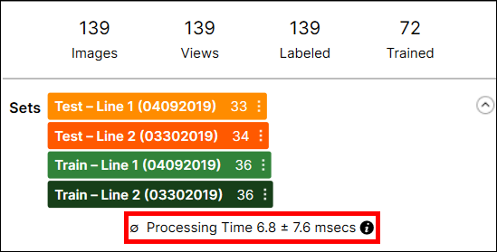 Processing Time is the average processing time per image in the last processing task, and it is the sum of the processing time and the post-processing time. The processing time for a stream containing multiple tools is not available through the VisionPro Deep Learning GUI, and you cannot estimate it by summing the tool execution time of the tools in the stream because the processing time includes the time required to prepare and transmit view information between tools.