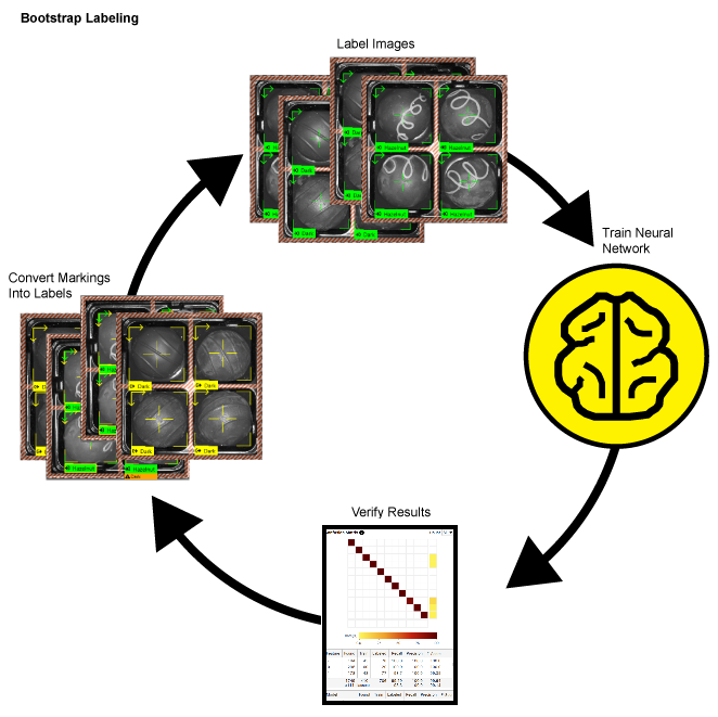 Since the Deep Learning software is based on learning, what the network is taught about the images is vitally important. Within the Deep Learning parlance, this process is termed “labeling.” Labeling is the process of a user identifying features or defects, and graphically illustrating them on the image. The label represents the ground truth for the tools and is used to train the tools and validate their performance.