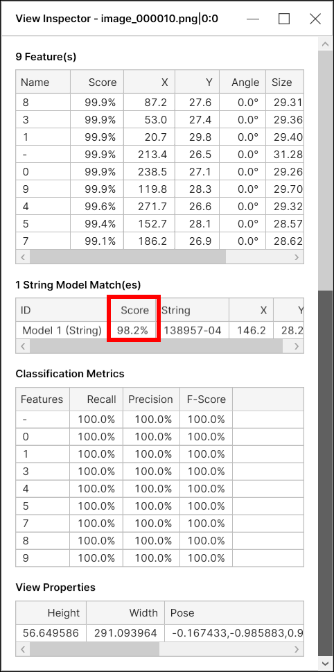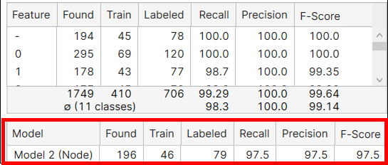 A found model is said to be a correct match (correctly marked model) if there is a labeled model in approximately the same position and if this found model has features that are close to the corresponding labeled features. The precision, recall, and F-score of model are calculated on this ground, and if there are multiple models in a view all model metrics are calculated by each model separately.
