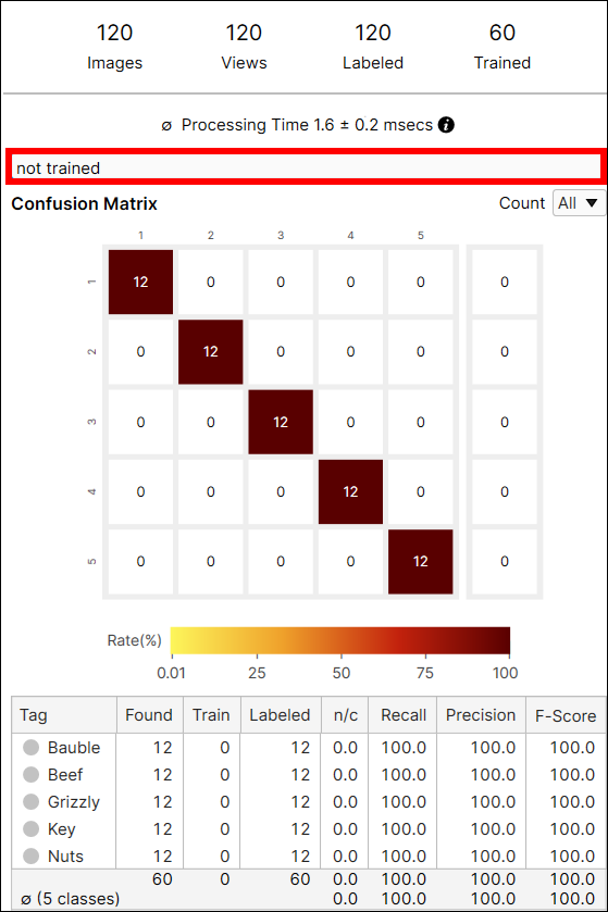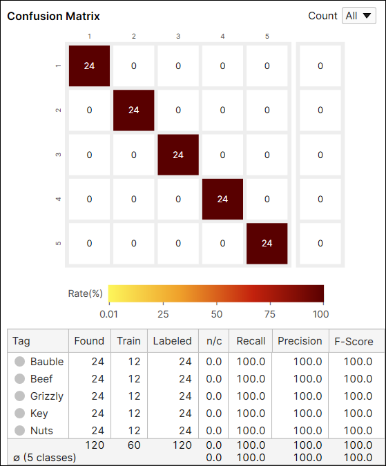 The Count option in the Confusion Matrix provides the result of the current tool calculated from all views (All), or only from the views that are not included in the training set (Untrained Views). You can switch the results between the one generated from every view including training and test images, and only from the untrained views which are the test images.
