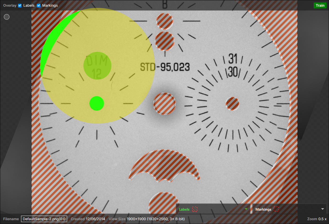 The default segmentation provides the tool with the complete image. Alternatively, you can manually adjust the ROI (right-click within the image and select Edit ROI) to configure the extracted view in terms of its size, position and orientation. In many cases, you need to adjust the Region of Interest (ROI) to define the view that the tool will operate within. You can adjust the size and placement of the ROI using the graphic handles in the image. This allows you to re-size the ROI, and to move it within the image.
