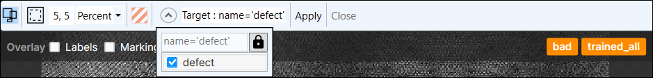 The Mask toolbar is launched by right-clicking in an image, and selecting Edit Mask from the menu. After you have applied the mask to one image, click the Apply button so the mask will be used by all the images in your training image set. Press the Close button to return to the process of constructing your Deep Learning application.
