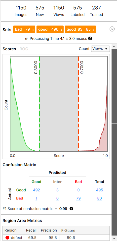 The False Positives and False Negatives are then summarized and represented again using the following metrics, which are the Precision and Recall, the statistical results used in all VisionPro Deep Learning tools.