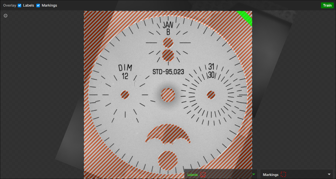 For each tool, there is a slightly different process, but the principle is the same. Once Labeling is completed, you will be ready to train the tool, and examine the Markings that the tool provides. You can toggle the display of labels and markings by either using the Alt + Left arrow and Alt + Right arrow keys, or from the right-click menu in the image.