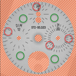 Green Classify in Focused mode, Red Analyze in Focused mode, Blue Locate and Blue Read tools analyze images based on the Feature Size that you specify. The feature size, which is based in pixels, functions as a hint to the tool about the expected size of "meaningful" or "distinctive" features in the input images. The best method for selecting a feature size is to examine the input images as if you were a human inspector. Note the features in the image that you would use to characterize the image as good or bad, to identify a defect or problem, or to determine where something was and what it was.