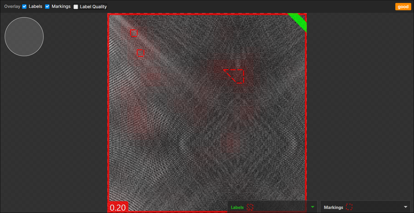 (N marked regions are considered as a single marked region)Example of 3 marked regions appear on the backgrounds, no pixel-wise labeled defects, "Good" labeled view: