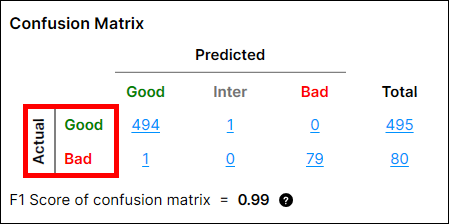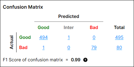 F1 Score of confusion matrix changes per the Count dropdown option. It is interpreted as the harmonic mean between the precision and recall of the current confusion matrix. If a view or a region is predicted as "Inter," it is counted as "Bad" for the calculation of precision, recall, and F1 Score.