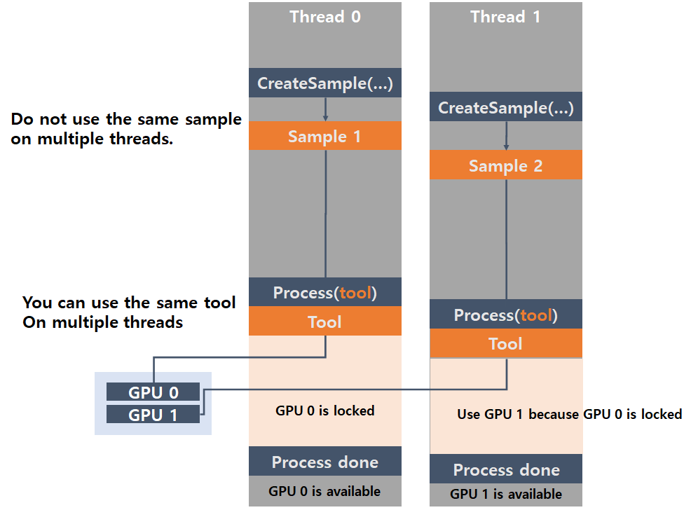 如果您提供一个空列表作为设备列表参数并在 2 个线程(线程 0 和线程 1)中处理此工具,则其中一个线程,例如线程 0,仅占用 GPU 0 一段时间来处理图像。
