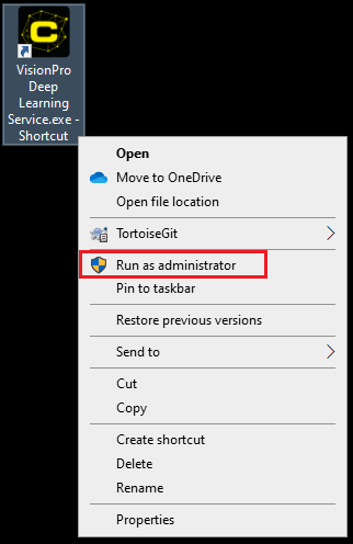 - Right-click the VisionPro Deep Learning Service application and create a shortcut to the application.