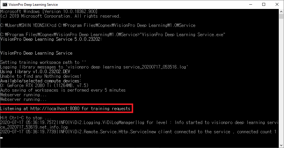 - Launch the VisionPro Deep Learning Service application(VisionPro Deep Learning Service.exe) to determine what port number the service will be using, which will be indicated by the "Listening at http://localhost:PortNumber" line (where "PortNumber" will be the port number assigned to the service, for example 8080) after the service starts.