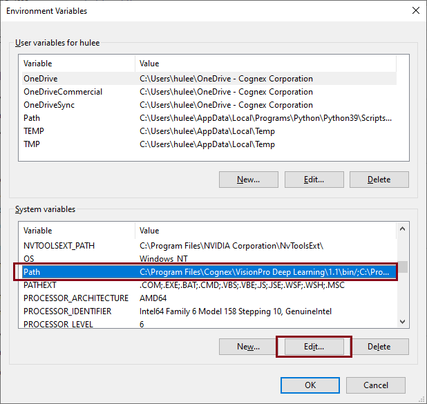 5. Find "C:\Program Files\Cognex\VisionPro Deep Learning\3.1\bin" on the list and click Move Up to move this path to the top of the list.