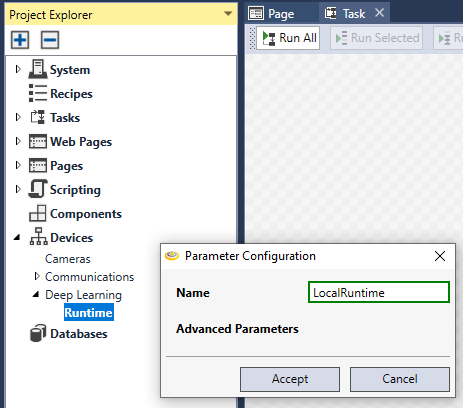 In the Designer, I cannot find Device > Deep Learning > Runtime > LocalRuntime after creating a new Designer project.