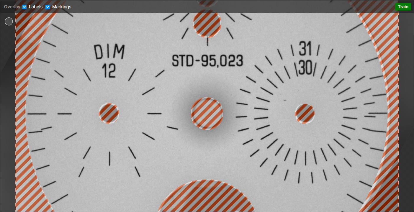 The images for this tutorial show watch dials at random orientations. You first need to use a Blue Locate Tool to determine the center and orientation of the dial. The resulting cropped and reoriented images can then be analyzed by a Red Analyze Tool. Since the dial also has holes which allow the presentation grid underneath it to be seen, you need to use a mask to prevent the Red Analyze tool from inspecting those areas.