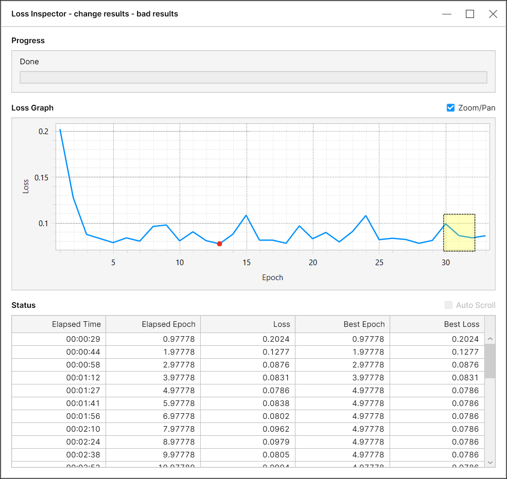 The loss inspector is a monitoring tool of the changes in the validation loss during training for High Detail modes (Green Classify High Detail mode and Red Analyze High Detail mode). From VisionPro Deep Learning 1.1, you can inspect the change of validation loss while training or for an already trained High Detail Mode tool.